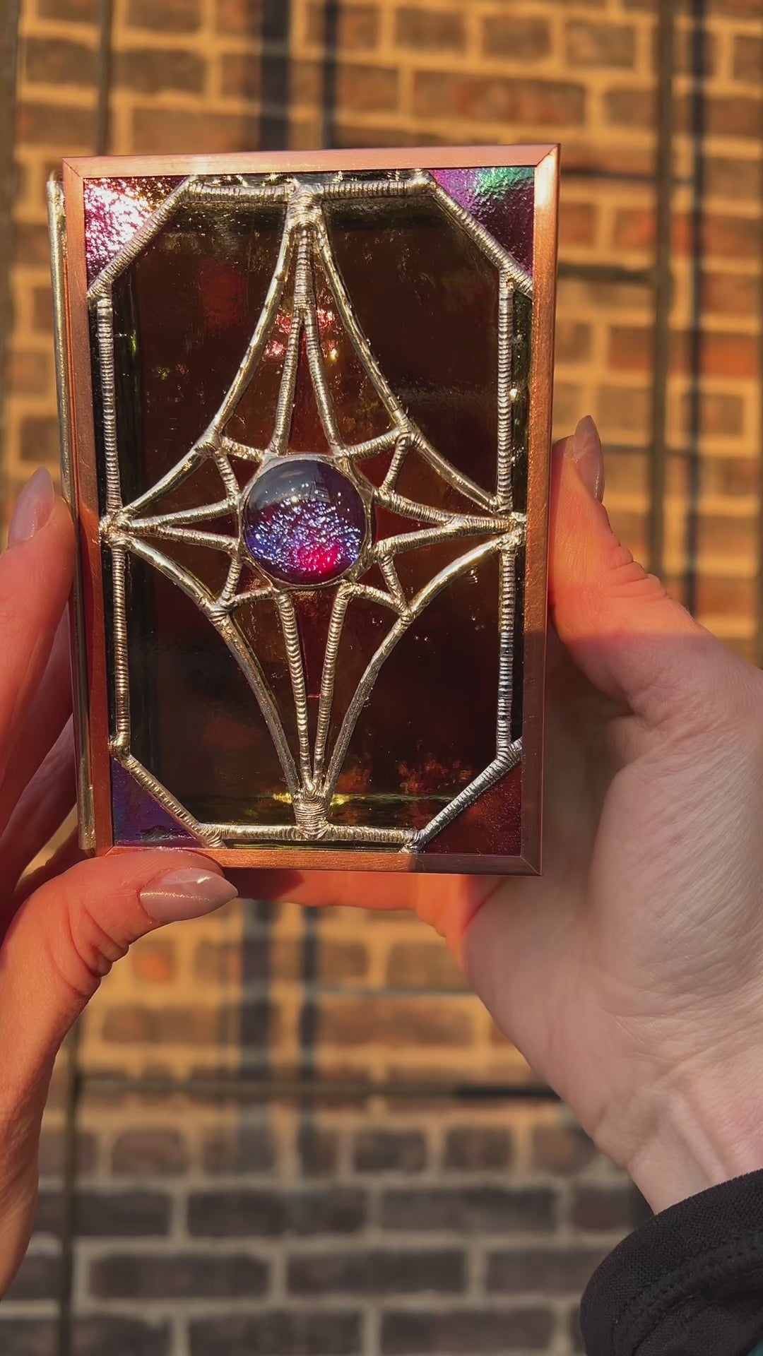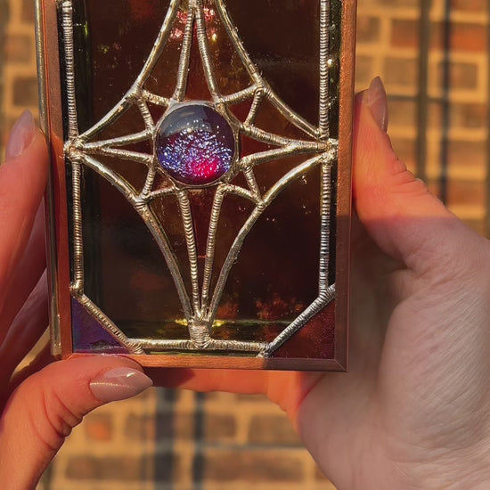 This box features some of my favorite glass that was hard to let go of (and is hard to come by in the first place). The center point of the star features vintage, glass cabochons on both the top and bottom of the lid - giving it an otherworldly, orb-like appearance. Framed in copper with both wavy and smooth solder.
