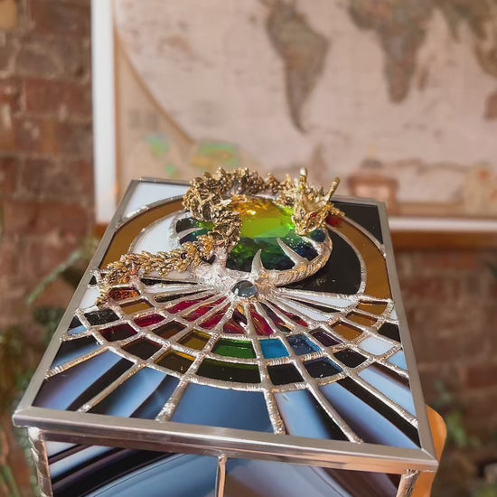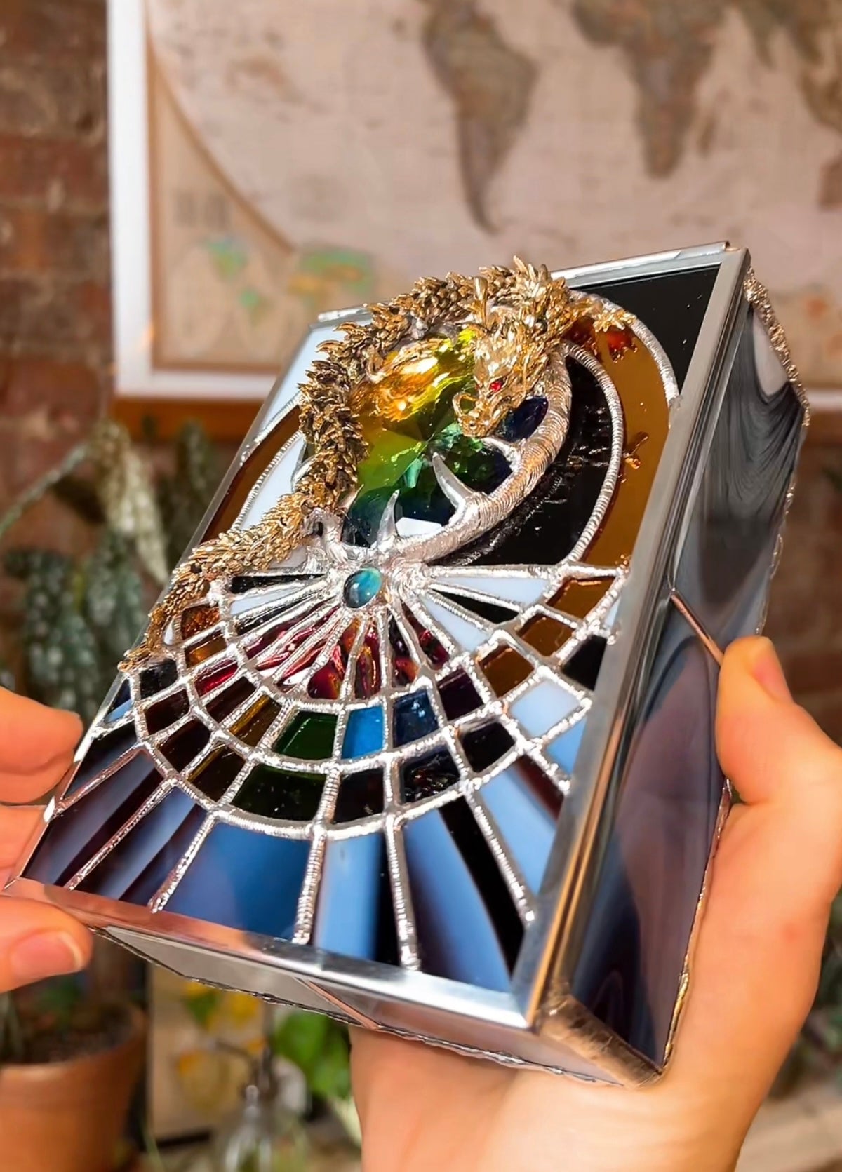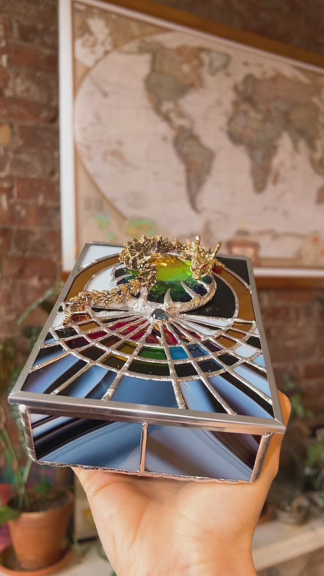 Black⊹white⊹the full spectrum of light combined with copper mirror and a discontinued titanium-esque glass base. The box is predominately opaque with the exception of a thin, transparent rainbow section that sparkles while the lid is closed (but really comes to life when backlit by the sun). Framed in zinc with silver solder in varying textures.